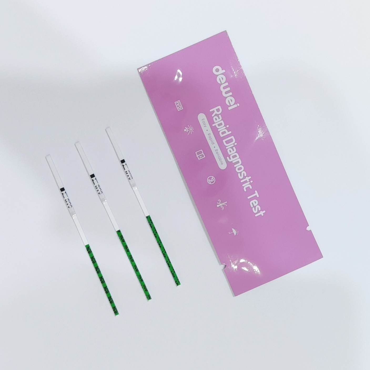 Positivo:Due linee sono visibili e l'intensità del colore della linea nella regione della linea di prova (T) è uguale o più scura della linea nella regione della linea di controllo (C).Un risultato positivo significa che il livello di FSH è superiore al normale.